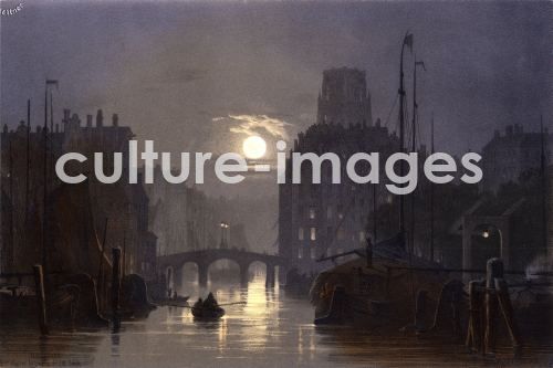 ROTTERDAM bei Nacht, Wasserwege bei Mondschein, mit Küstensegler und Binnensegler, Boote, Dalben, Rammpfähle, Anleger, Brücken, Speicher, Häuser Stäck, Joseph Magnus Stein. Koloriert ca. 1852