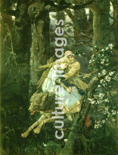 Ivan Tsarevich riding the Gray Wolf, Vasnetsov, Viktor Mikhaylovich (1848-1926), pastel on canvas, Russian Painting of 19th century, 1889. Russia, State Tretyakov Gallery, Moscow