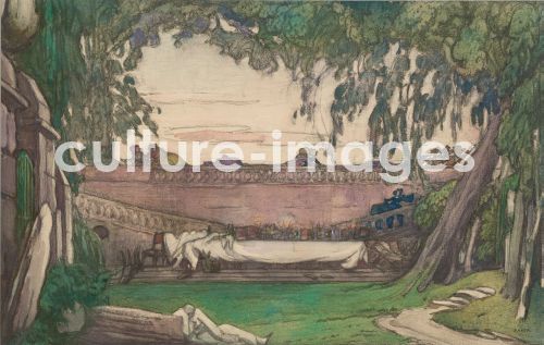 Bakst, Léon (1866-1924), Stage design for the ballet Carnival by R. Schumann, Watercolour and pastel on paper, Theatrical scenic painting, c. 1910. Private Collection
