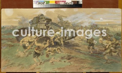 Samokish, Nikolai Semyonovich (1860-1944), The Capture of a Tank in the Crimea, Watercolour on paper, Realism, 1923, State Central Military Museum, Moscow