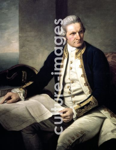 James Cook (1728-79) English explorer and navigator and hydrographer in naval uniform, seated, with hand on map of the world. Portrait by Nathaniel Dance (1735-1811) English painter.