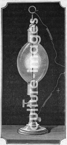 Davy's electric egg. Intense light from voltaic arc between points of two carbon rods. It was not until some years after Davy's death in 1829 that carbon arc lamp widely used because rods need frequent adjustment. Davy used boxwood carbon. Engraving . Humphry Davy (1778-1829).