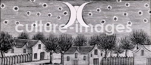 The comet of 812 directly approaching Earth. The crescent shapes are really streamers from the tail seen head-on, the central part of the crescents and the white patch above where they join is the head of the comet. From Historia universalis omulum cometarum by Stanislaus de Lubienietski (Amsterdam, 1666). Engraving.