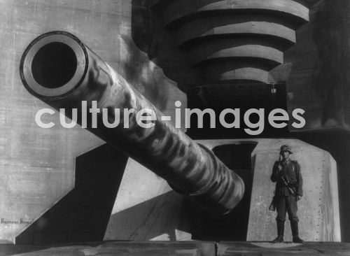 World War II 1939-1945. Barrel of a large gun with German soldier at fortifications, 1943. Weapon Armament Heavy Artillery Guard Rifle