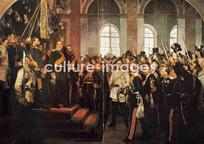 Wilhelm I (1859-1888) King of Prussia from 1861, being proclaimed first Emperor of Germany, 1871. After the defeat of France in the Franco-Prussian War of 1870-1871, as a gesture of further humiliation of the French, on 18 January 1871 Wilhelm was crowned in the Hall of Mirrors at Versailles. the palace built by Louis XIV. Otto von Bismarck, German Chancellor, in which coat in centre.