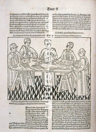 A dissection in progress. From Le livre de la propriete des choses (On the Properites of Things) written by the English Franciscan monk Bartholomew Glanville, called Bartolomaeus Anglicus, c1230-1240 and translated by Jean Corbechon in 1372. Woodcut from printed edition c1520.