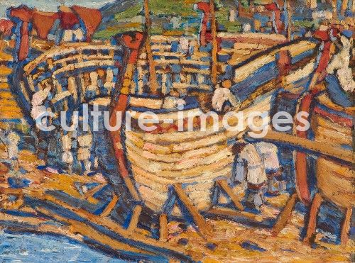 Roerich, Nicholas (1874-1947), Building the Ships. Study, Oil on wood, Symbolism, 1903, Russia, International Centre of the Roerichs, Moscow, 31x41, Genre,History, Painting,