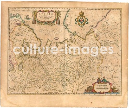 Blaeu, Willem Janszoon (1571-1638), Map of Russia (From: Theatrum Orbis Terrarum...), Copper engraving, watercolour, Cartography, 1645, Holland, Private Collection, History, Graphic arts,
