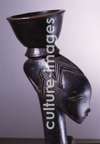 Heddle pulley with the face of a woman balancing a bowl on her head, the favourite theme of the Master of Bouafle, During weaving the pulley faces the weaver. Ivory Coast. Guro.
