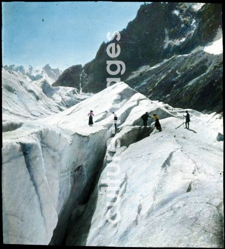 Above the normal transition point are these dangerous large crevasses that can be overcome only with a guide and secured with rope, Hand colored slide, from lecture series: The Mont Blanc. Hand colored slide, from lecture series: The Mont Blanc, , France, 1930, Collection Carl Simon.