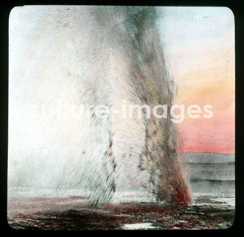 Water is expelled at regular or irregular intervals like a fountain from the hot spring, Hand colored slide, from lecture series: Earthquakes and volcanoes. Iceland, 1930, Collection Carl Simon.