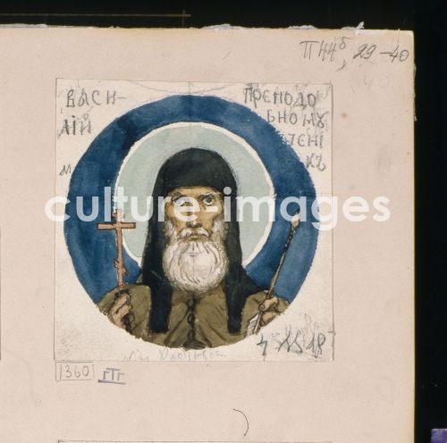 Vasnetsov, Viktor Mikhaylovich (1848-1926), Holy Prince Basil of Rostov (Study for frescos in the St Vladimir's Cathedral of Kiev), Watercolour on paper, 12x11.8, Russia, 1884-1889. Art Nouveau, State Tretyakov Gallery, Moscow,