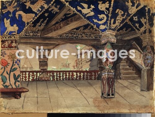 Vasnetsov, Viktor Mikhaylovich (1848-1926), Stage design for the theatre play Snow Maiden by A. Ostrovsky, Oil on cardboard, 22x29.5, Russia, 1881, Theatrical scenic painting, State Museum Abramtsevo Estate, near Moscow,