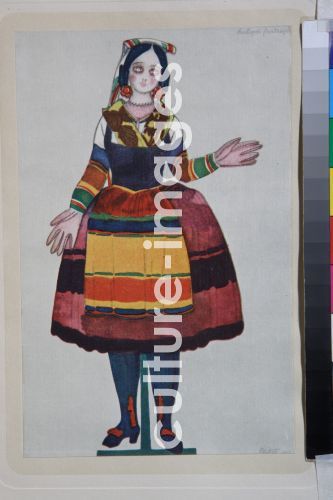 Bakst, Léon (1866-1924), Italian puppet. Costume design for the ballet The Magic Toy Shop by G. Rossini, 1919, Colour lithograph, Theatrical scenic painting, Russia, Private Collection,