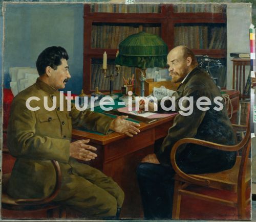Shestopalov, Nikolay Ivanovich (1875-?), Lenin and Stalin, 1938, Oil on canvas, 131x152, Soviet Art, Russia, State Museum- and exhibition Centre ROSIZO, Moscow,