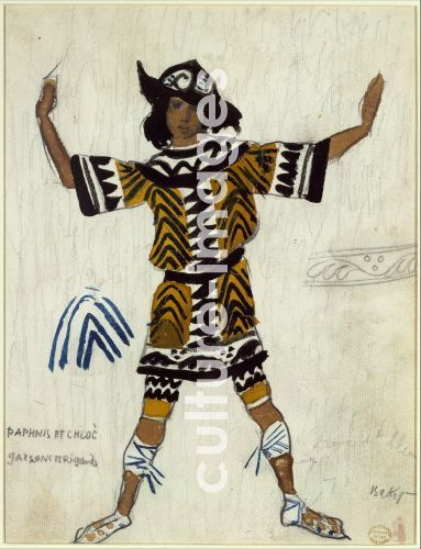 Bakst, Léon (1866-1924), Costume design for the ballet Daphnis et Chloé by M. Ravel, Gouache on paper, 27x21, Theatrical scenic painting, 1912, Russia, Metropolitan Museum of Art, New York,