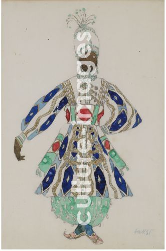 Bakst, Léon (1866-1924), Costume design for the revue Aladin, or the Wonderful Lamp,Pencil, Gouache and gold colour on paper, 48x32, Theatrical scenic painting. Russia, 1919, Private Collection.