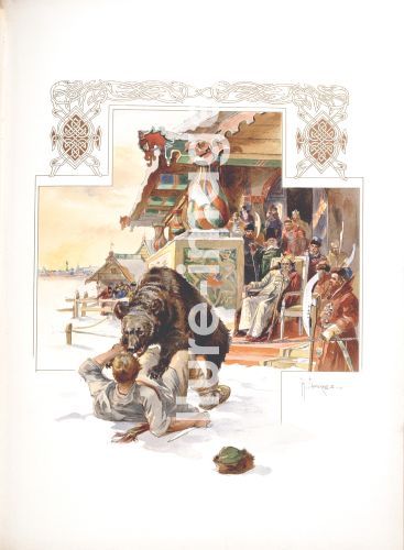 Samokish, Nikolai Semyonovich (1860-1944), Bear baiting. Illustration for The Grand Ducal, Tsarist and Imperial Hunting in Russia by N. Kutepov, Chromolithography, 36,2x26,7, Russia, 1896, Book design, Private Collection.