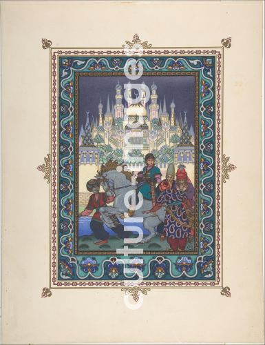 Zvorykin, Boris Vasilievich (1872-after 1935), Illustration for the Fairy tale of Ivan Tsarevich, the Firebird, and the Gray Wolf, Colour Lithography, 27,3x20.5, Russia, c. 1925, Book design, Private Collection.