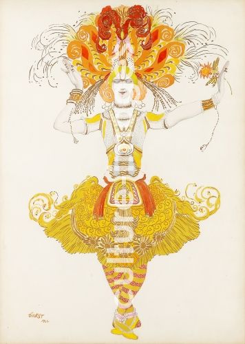 Bakst, Léon (1866-1924), Costume design for the ballet The Firebird (L'oiseau de feu) by I. Stravinsky, Watercolour, gouache, gold und white colours on paper, 68x49, Theatrical scenic painting, 1922, Russia, Private Collection.