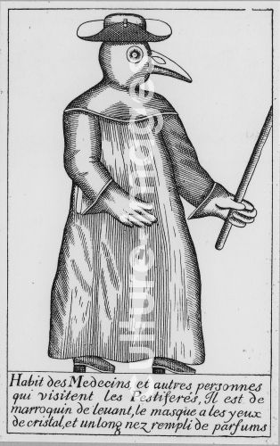 Physician in protective clothing during an outbreak of Plague. From Manget "Triate de la peste", 1721.