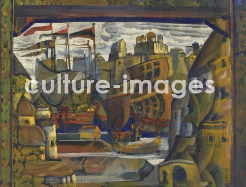 Roerich, Nicholas (1874-1947), The Novgorod Market. Stage design for the opera Sadko by N. Rimsky-Korsakov, Tempera on canvas, 71x91,5, Symbolism, 1920, Russia, Private Collection,