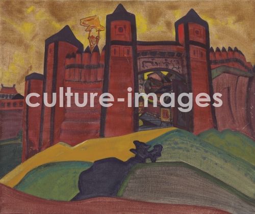 Roerich, Nicholas (1874-1947), The Gates of Tmutarakan. Stage design for the opera The Tale of Tsar Saltan by N. Rimsky-Korsakov, Tempera on canvas, 64,1x76,8, Theatrical scenic painting, 1919, Russia, Private Collection,