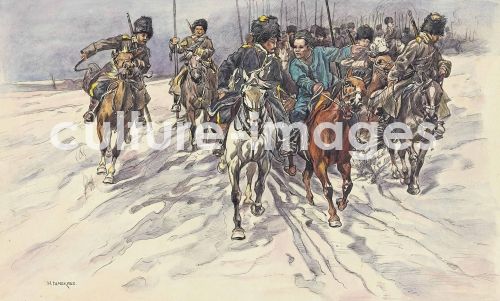 Samokisch, Nikolai Semjonowitsch (1860-1944), Der russisch-japanische Krieg: Regiment von Baikal-Kosaken, Aquarell und Tusche auf Papier, 27,4x39,2, Realismus, 1904, Russland, Privatsammlung,