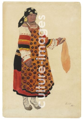 Bakst, Léon (1866-1924), Peasant woman. Costume design for the Vaudeville "Old Moscow" at the Théâtre Femina in Paris, Watercolour on paper, Theatrical scenic painting, 1922, Russia, Private Collection,