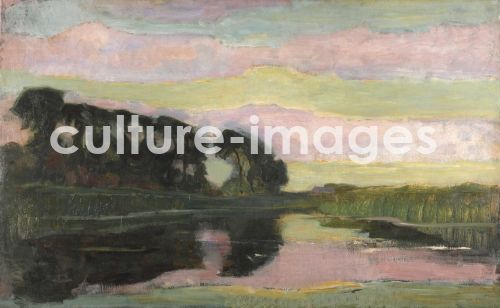 Mondrian, Piet (1872-1944), River landscape with pink and yellowgreen sky, Oil on canvas, 75x120, De Stijl, ca 1907-1908, Holland, Gemeentemuseum Den Haag,