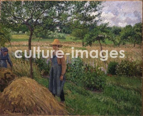 Pissarro, Camille (1830-1903), Gardener standing by a haystack, overcast sky, Eragny, Oil on canvas, Impressionism, 1899, France, Isabelle and Scott Black Collection,