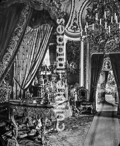 The Bavarian King Ludwig II built Schloss Linderhof from 1870 to 1886. Looking into the audience chamber, source: Slide Hand colored, of lecture series: Oberammergau and his Passion Play. Collection Carl Simon.