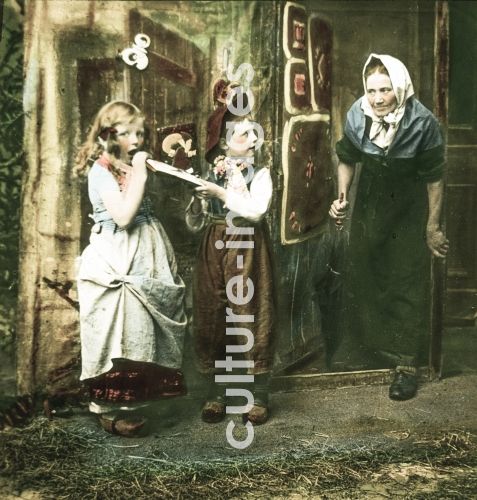 Die Hexe entdeckt Hänsel und Gretel. Eine Frau tritt aus einem Knusperhaus und betrachtet zwei Kinder, Quelle: Dia-handkoloriert, aus Vortragsreihe: Hänsel und Gretel The witch discovered Hansel and Gretel. A woman emerges from a gingerbread house and sees two children, source: slide hand-colored, from lecture series: Hansel and Gretel. Collection Carl Simon.