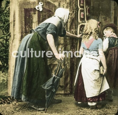 Die Hexe lockt Hänsel und Gretel in ihr Haus. Eine Frau führt zwei Kinder in ein Haus, Quelle: Dia-handkoloriert, aus Vortragsreihe: Hänsel und Gretel The witch lures Hansel and Gretel into her house. A woman leads two children in a house, source: slide hand-colored, from lecture series: Hansel and Gretel. Collection Carl Simon.